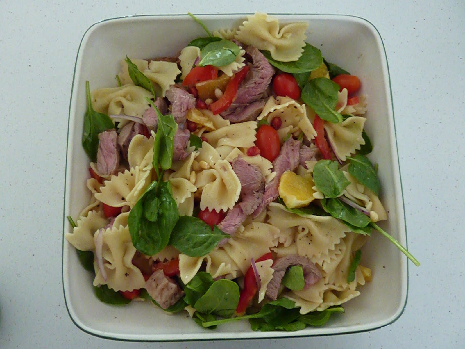 Easy as throwing together some pre cooked bow pasta, with olive oil, salt and pepper, baby spinach, cherry tomatoes, pomegranates, orange and lovely lamb. One of those good dishes where throwing together a bunch of things from the fridge seems to make for a good salad – the more, the merrier. Ready in a flash and good and healthy.