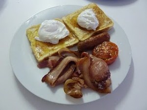 This is what you call a breakfast of champions! My cousin Mark whipped it up and I swear they are the most perfect little poached eggs I have ever seen!! As easy as boiling up a big pot of water, with some white vinegar added, then throwing the eggs in then scooping them out with a slotted silver spoon. They were seriously wonderful. It’s one of the best breakfast techniques I’ve picked up. I think I always found poached eggs to daunting. Nice to know they are do-able! If you fancy them soft they only take a few minutes.