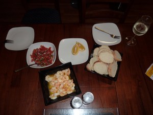 So all in all the whole meal was very tasty – dip the bread in, eat a prawn, then top the bread with some of the bruscetta. Not too bad 🙂 With a glass of chilled white on the side and a spritz of lemon on the prawns, it was actually quite a nice light meal, but totally yum, made me feel a little bit masterchef 🙂 Living the dream.