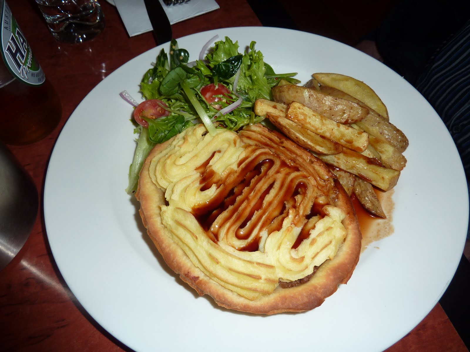 We went straight to mains. Here is Dad’s lunch, he had the pie of the day, which on this occasions was like a potato topped shepards pie, which from all accounts was very tasty and I had one of the chips – nice! Also good that they included a side salad, as that much pasty can be quite heavy.