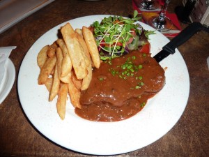 It wasn’t particularly busy when we arrived, a decent crowd though for a week night and we were quickly seated. We both ordered the steak, which came with your choice of beer battered chips (my choice) or mashed potato (GG’s choice). There was also a side salad included. There was also a selection of sauces on offer and we both went with pepper.
