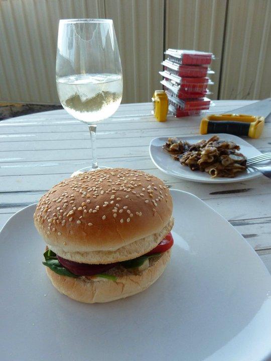 So finally just need to get everything all set up on the burger buns. I prefer sweet chilli sauce, while GG enjoys tomato sauce. Then load up with salad and a patty…. delish!