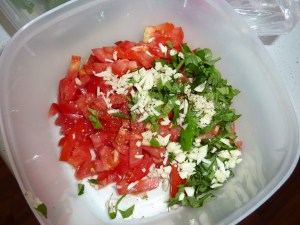 Bruschetta is nice and fresh and tasty and a delight in summer. How do I do it? Dice up some nice ripe tomatos, add garlic, salt and pepper, fresh basil and some good olive oil.