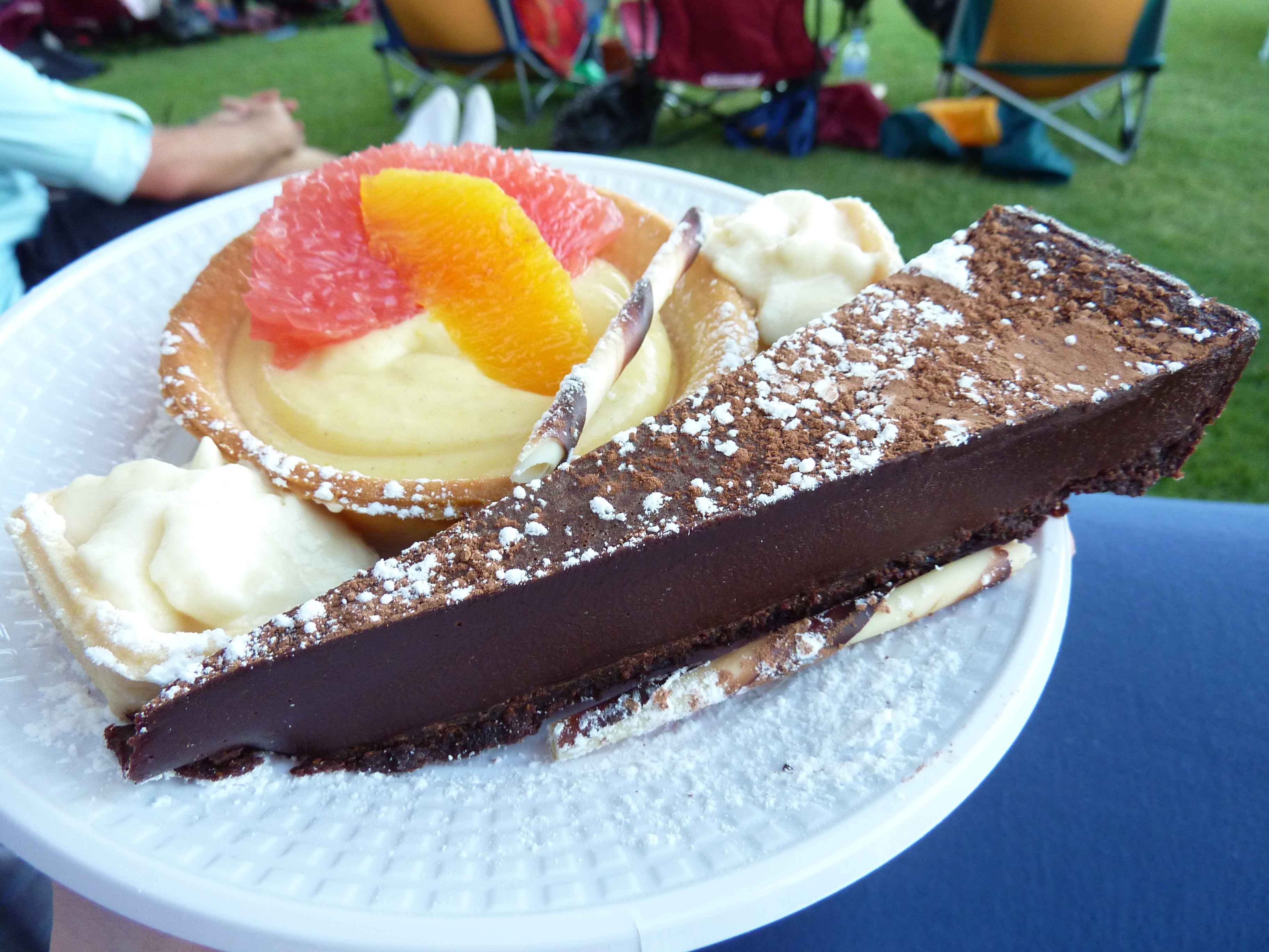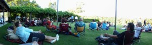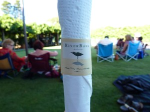 We found ourselves a spot on the grass and then headed inside to pick up our platter. It made me hungry just looking at it, given the impressive selection! There was prosciutto wrapped asparagus with white truffle oil, garlic prawns marinaded in dill, cacciatore sausage with freshly squeezed lemon, potato and red onion salad with wholegrain mustard seed, roasted field mushrooms with Shiraz, Dukkah & olive oil, pickled beetroot with Star Anise, smoked salmon with baby capers on wholemeal toast, baked Turkish bread with a selection of dips and then also a selection of cheeses with homemade fruit bread & crackers. All I can say is wow – the flavours were all delicious! My favourites were probably the potato salad, really liked the addition of the seeded mustard and also the cheese! Can’t go wrong with brie and I think the other was a nice cheddar. Worked a treat with the fruit bread and a little of the fig jam. And for our wine choice we went with a bottle of the 2007 Celebration White, worked perfectly with the food and the beautiful warm evening.