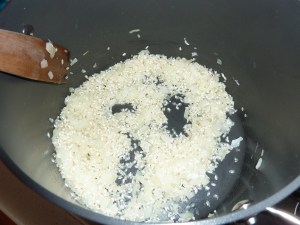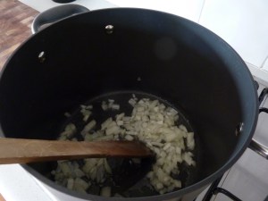 I peeled about 12 decent sized prawns and had those clean and read to go. Then I diced up an onion, and also a couple of cloves or garlic and a medium sized red chilli (I’m not that brave so most of the seeds didn’t make their way into the meal. So first step I put the diced onion into a pot with a pour of olive oil, you basically want the onion to soften and go all glossy looking.