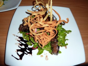 We decided we’d just go with mains though and in the end both couldn’t go past the lamb skewers. They came marinated in mint balsamic and garlic, served on roast vegetables, rocked and Danish fetta salad ($25.50)I guess I wasn’t too sure what to expect but I was more than pleasantly surprised with what was presented. Perhaps the deep fried pasta on top wasn’t required, but it looked a little bit fancy. And the lamb was delicious, really good quality and nice flavours. And the salad underneath – excellent – plenty of rocket, roasted sweet potato and beetroot and then soft goats cheese, all with a balsamic vinegar dressing. The combination worked really well together.