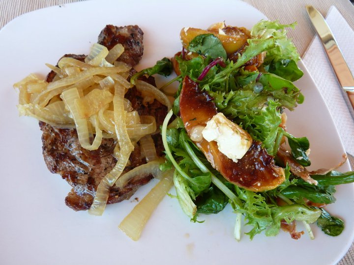 So GG was in charge of the meat and I caramelised some onion (slice up some onions, put into a frying pan with some oil and salt, cook til glossy, then add some hot water and simmer til it softens) and also made a salad from our BBQ Collection cookbook by Peter Howard, described as “The Ultimate Guide to Cooking on the Grill”