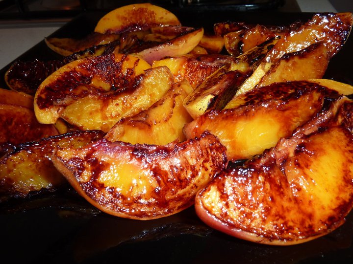 So we bought about 4 or 5 nice ripe peaches and sliced those up. They then had to be caramelised, so popped into a pan with a little oil, til the darkened up and the outside almost had like a peachy caramelly finish. Basically from this