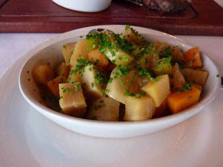 So I went with the pork chop ($30) and Helen ordered the skirt steak ($26), which came with mash, and then also got a side serve of their Vegetable Barigoule ($7.50).