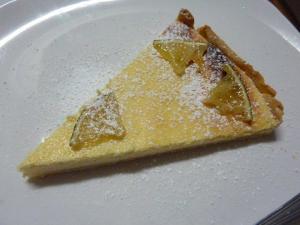 The pie just needs to go into the fridge to cool, then when you are ready to serve, dust with icing sugar and pop on a few pieces of limes, which we cooked in a sugar syrup.