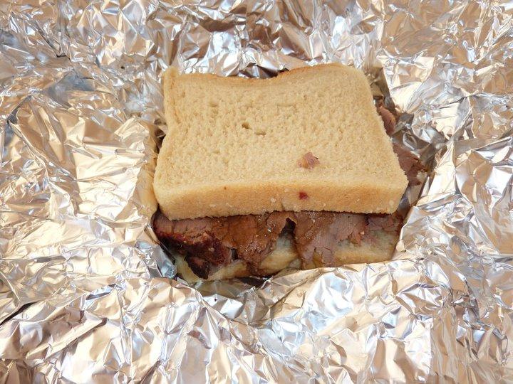 I wasn’t sure about the youth behind the counter when I went out to place my order…. Would this youngster really make a decent sandwich? I need not have worried though. He clearly had many hours of sandwich making experience under his belt – deftly slicing the meat into generous and chunky slices, before loading it onto bread, then with a sprinkle of salt and pepper and a splash of the gravy, it was wrapped in aluminium foil and we were ready to roll.