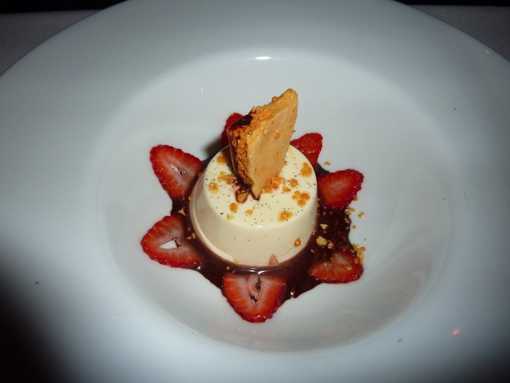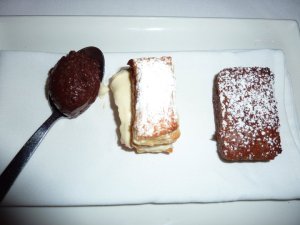 So next up was dessert, and it was a tricky decision as I love all things sweet. GG had a lot of time for panna cotta so he locked in the honey comb panna cotta that was on offer. I decided I would give the chocolate assiette a go. Let’s face it, chocolate done three ways was always going to have appeal – it was a chocolate mousse, a white chocolate Millefeullie and then an orange and chocolate cake. The flavours of each were delicious, but the one thing that I found strange was that the three chocolately things were served on a plate, with a fabric serviette underneath? Strange, given that it ended up with chocolate smears all over it. It could have been to help balance the spoon of chocolate mousse though I suppose. I did enjoy my dessert, as did GG, so it ended both our meals on a high.