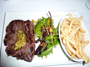 Our meals arrived and my wagyu was served sliced with the paris butter on top and with a dish of french fries on the side. I think the thing that struck me with my first bite was that it was served warm, but meat is left to rest so I suppose that accounts for that. My first bite was decent. But a few slices though there was quite a big sinew running through the meat so it made a medium rare, warm steak a very chewy affair. And the french fries were fine but nothing too special. I did like the beans though, served crunchy with a garlicy butter – very, very nice. In all though I was disappointed with my mains selection.