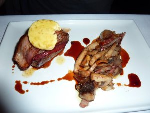 We figured on this outting that two courses would be more than enough so we both started perusing the menu for what to have. Anything on the mains menu was available so this made it a tricky option. One thing that surprsied me was the lack of white meat options, there was a fish choice available, but no chicken or pork. I wasn’t too fazed really, I’m not adverse to red meat or anything, just thought it was interesting. We were quaffing our bottle of the house white at this time, our delightful drop – crisp, clean! Cheers to Deakin Estate for that one! I actually decided I would try the