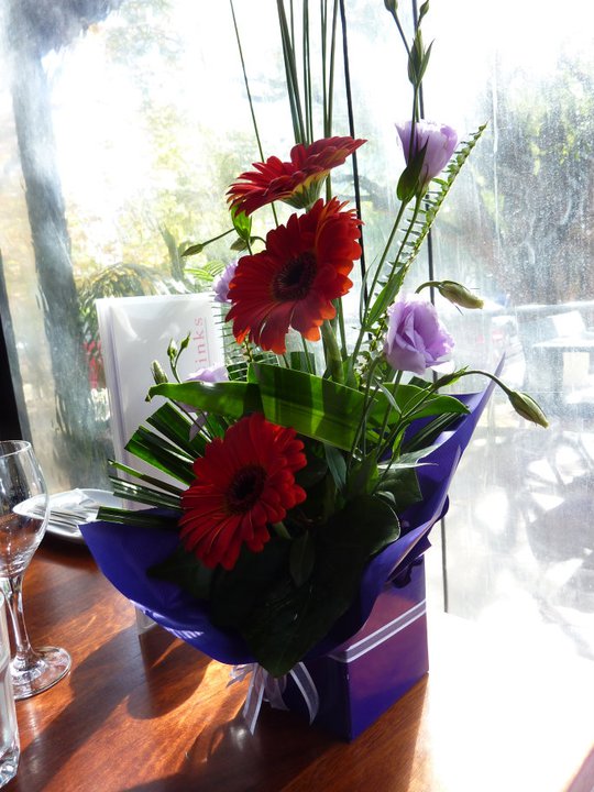 I was reminded of the importance of quality company the other day when I went to lunch. A good friend of mine works in Subiaco so we decided we’d take advantage of the new Entertainment Book and find somewhere central to both of us and decided on Black Toms in West Perth for a Friday lunchtime catch up. 2 for 1 mains is always a plus. I like what they’ve done with the decor these days – very open and looks a little trendy with their pretty little lamp collection sitting above the bar. Also a plus is that in the restaurant they close it all in with heavy plastic sheets that actually works wonders against the wind that was blowing a gale that day. So I arrived first and was asked about water as soon as I was seated. So can’t fault the attentive service. My lunch partner didn’t take too long to arrive and given that it had been her birthday earlier in the week I had some flowers waiting for her. And because I arrived first I used that time to take a picture of the flowers…. its just how I roll I guess – love my photos 🙂