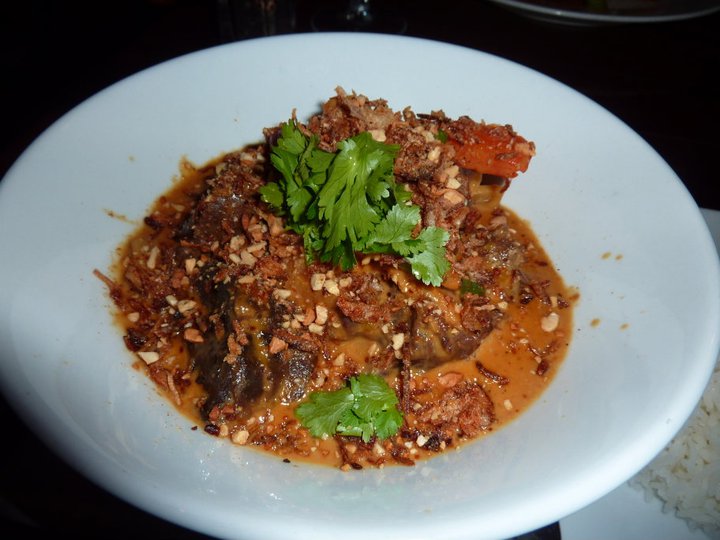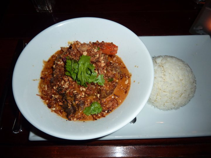By this stage I was wondering whether we’d actually needed mains because I think with one more entrée between us I would have been sorted. But enter my giant Massaman curry of braised wagyu beef shin with pumpkin, green beans and bamboo shoots, served with Jasmine rice ($33). I’d never had a massamen curry before, but earlier in this season of Masterchef there had been a challenge where they had to add ingredients to improve a massaman curry. So I was swayed by the memory and keen to give it a go. It was a big serve – full of beef and chunky vegetables. I didn’t mind the flavour, was fairly mild as curries go. It also came with a serve of steamed rice, but I didn’t eat too much of that, was more keen to try and put a respectable dent in the curry. I’m not sure I actually succeeded.