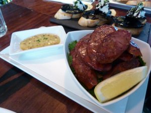 We also had a bowl of chorizo, which came with a honey mustard dipping sauce. The added bonus with the chorizo was that it came served on a white cabbage salad which was sort of like sauerkraut. It was super tasty with the spiciness of the sausage.