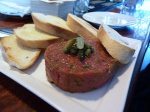 I was also impressed with the Steak Tartare, shallots, cornichons, baby capers and warm toast ($14.50). I’ve grown up eating it but you just don’t see it on menus around town that often. So it was to be a treat. It had quite a strong pickle flavour through it, but the salty capers on top and the quality cut of meat, it was really delicious and it had these teeny tiny little gherkins decoratively placed on top, which was super cute.