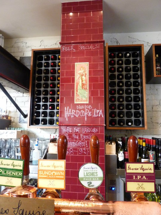 Which isn’t to say it was empty, it was comfortably occupied I’ll say. The one different thing about Five is that there isn’t really too many set traditional tables and chairs, it’s more a combination of lounge chairs, benches, crates, an eclectic mix really. Now by the time we arrived it was a choice really between the crates with pillows up near the back or taking a seat at the bar. We went the bar option. They have a really impressive selection of drinks – particularly beers and ciders. I spied a tasty looking pear cider from New Zealand Montheith – served on ice, it was a delight. GG went for a glass of red…. He wished he had my cider because of its general awesomeness.