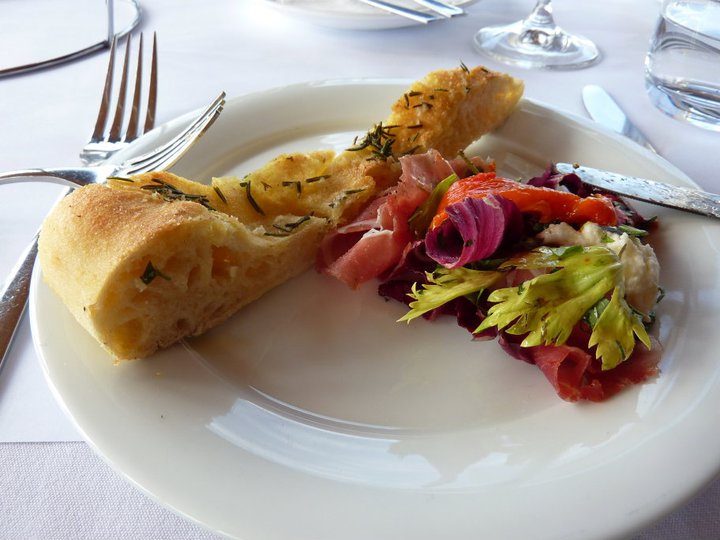 So Thursday lunchtime it wasn’t overly busy that side of the river. We were lucky enough to have a table in the front section of the restaurant and the view really is spectacular. We started with a cleansing ale of the Peroni persuasion. It was actually the first time I’d tried Peronis, quite nice and light. So while we enjoyed our beers the friendly waitress outlined the specials of the day for us and I was pretty impressed, there were a lot of them and they all sounded amazing. At In Contro one thing they do which is quite good is do tiered share plates for their entrees, which for our group of three was a popular idea. The toughest part was choosing which three items to fill the tiers – the options included, scampi, arancini, lamb culets, prawns, beef – they were some tantalising choices. In the end we went for the Scampi, the Lamb Cutlets and the arancini. We were then asked if we would like bread and again it was a tough decision. There was one bread with truffle oil and another than came with a tasty sounding mix of prosciutto, radico, goat’s cheese and marinated capsicum. Hard to go past that one, so we ordered some of that.