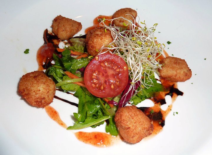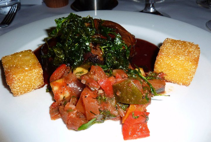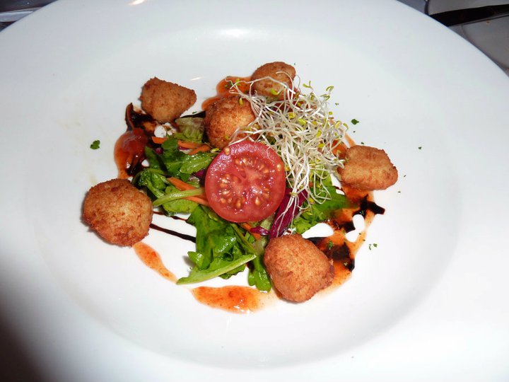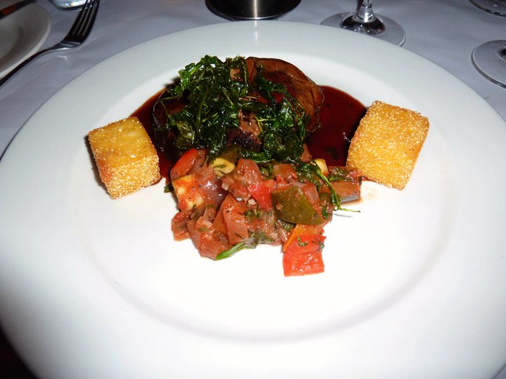 Soon enough our entree arrived, which was a delicious looking dish of truffled califlower croquettes on persimmon chutney with garden salad. The croquettes were creamy little deep fried wonders and went perfectly with the sweetness of the persimmon chutney. Then with a little freshness of the garden salad it was just a wonderful combination. Really, really enjoyed this dish and the wine group had to discuss whether the mystery semillion sauvignon blanc or the chardonnay went better. I thought the chardonnay was better suited with its buttery creaminess.