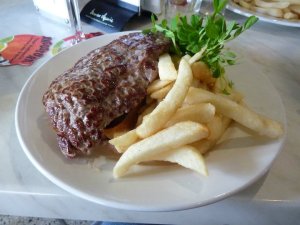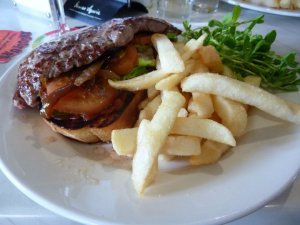 So I decided that I would give the Open steak sandwich On toasted garlic bread with onion, tomato, lettuce, egg, tomato chutney & chips ($17.50) a go. I have to say that while I had read open sandwich on the menu I think I had figured that the extra slice of bread would maybe we on the side. So I think I was a little daunted when it wasn’t. I had ordered my meal without the egg so perhaps it would have presented better with a fried egg on top. Looked a bit lacking without it. Just like a giant piece of steak next to a mountain of chips and a few sprouts.