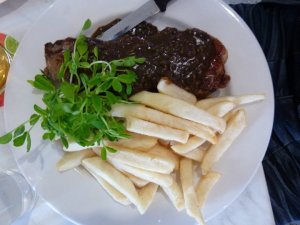 Now GG was suitably more impressed with his selection of Sirloin Steak Served with chips or baked potato & choice of sauce(mushroom, peppercorn or bearnaise) ($25.50). It was a huge bit of meat that arrived, cooked to medium rate perfection with a generous pour of peppercorn sauce. And similarly to mine, he wasn’t left wanting for chips – plenty with every serve.
