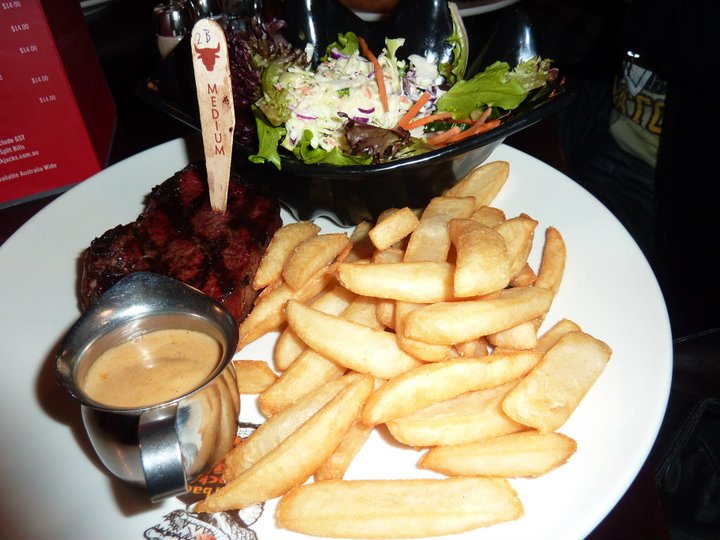 No one was up for starters on this visit so we all perused the menu to decide what to have for mains. Now I like steak but never want something too giant, so I thought the Sparrows ($26.95) sounded do-able. A Prime 300g Rump, minimum 100 day grain fed, seared to perfection. And all meals come served with your choice of a jacket potato with sour cream or chunky chips accompanied with a garden salad and coleslaw. I also splashed out an extra $2.95 for a dish of pepper sauce (from a choice of Peppercorn, mushroom, diane, creamy garlic, fiery red rock, firecracker sauce & cheese sauce.) It was money well spent as it was nice tasty sauce. Added something extra to the steak and worked a treat as a tasty dipping sauce for the chips. I was pretty impressed with my meal. It was a nice steak and I thought the inclusion of the coleslaw and garden salad was good. I was fairly confident that I wasn’t going to get through 300g of steak but I wasn’t overly worried because the beauty of dining with my GG is that he’s always willing to lend a hand with surplus steak.