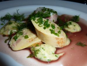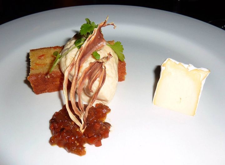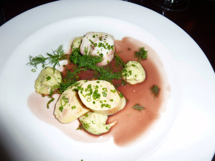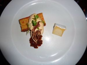 From salad we went to fish – confit de cod, cod & fois gras sausage, brandade, le di vin. Again I had my concerns about this course, just given my stance on fish. However it wasn’t as confronting as the sardine. I actually particularly enjoyed the cod and fois gras sausage. It was really tasty. The fishy flavour of the confit de cod was also a lot milder and it was perfectly cooked fish. Delightfully moist. Plus the red wine sauce definitely enhanced this course further, all the more so because of the two glasses of red that were served along with it. Both the Bella Ridge Estate Tempranillo 08 and Viognier 06 were a delight. The style of wine of each meant that they didn’t over power the fish.