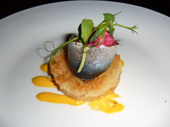 So we then did a quick table shift so we were more right in the thick of things. The first course was an amuse – sardines, toast, beetroot, snow pea tendril. It did look very pretty; the silvery fish with the brightness of the beetroot. Now I’m not the hugest fish fan so I was always going to be a hard sell on this course. As far as fish go, Freo Sardines do seem to have a particularly fish flavour. It was reasonably well offset by the other ingredients, particularly the beetroot. So flavourwise, only because I’m not a huge fan of a fishy flavour, it wasn’t my favourite, but presentation wise it set the scene for some beautiful courses ahead. And the Bella Ridge Bella Blanc was well matched to this course, very refreshing.