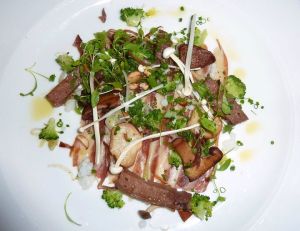 The second course was a salad – tongue, beef bacon, mushroom, broccoli, smoked almonds, horseradish. It definitely sounded liked an interesting combination when described. And again it looked lovely. All the ingredients looked fabulously fresh. And whilst I had been daunted by the idea of tongue before I tried it, it was actually delicious! The beef bacon too was tasty, but it had almost a prosciutto consistency and I over committed on one particularly large mouthful of it and found myself chewing for a fair while. My own fault really though and now I know it’s best eaten in dainty, lady like pieces. Once I learnt this and combined it with some of the other additions on the plate the flavours did marry up well. And the wine from this course definitely deserves a mention. This was the Bella Ridge Bella Fino 06. I’ve never tried a Fino before and it’s probably not something you’d find yourself quaffing with your feet up on the couch on a Friday night. It had a very bold flavour and I would assume a high alcohol content. Tasted to me more like a grappa or similar style aperitif. So something different that’s for sure. Its boldness worked well with the bold meat selections that had in this course.
