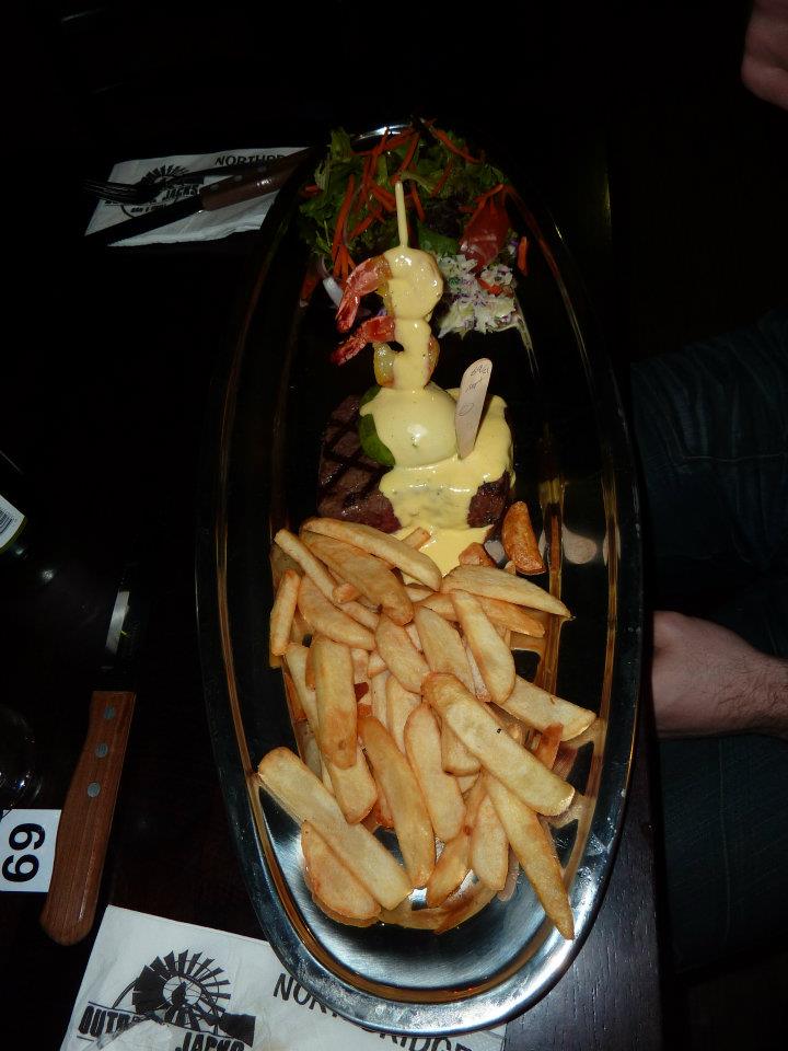 For our mains I decided to see how the Northbridge Sparrows (Prime 300g Rump, minimum 100 day grain fed, seared to perfection – $26.95) compared with the one I’d had in Rockingham. Again I asked for a pepper sauce on the side, pepper sauce and steak just makes good sense to me. GG went for something different and ordered the Neptunes Steak. (Prime 300g Rump, minimum 100 day grain fed, flame grilled, topped with sliced avocado, grilled prawns and bearnaise sauce – $33.95). A surf and turf of sorts.