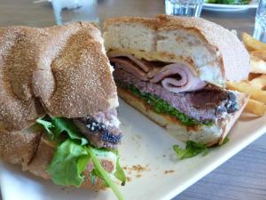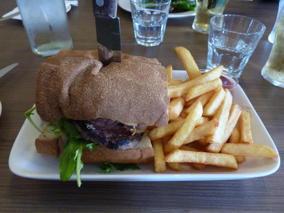 So even before we had arrived I had decided that I was in the mood for a steak sandwich and their’s sounded delicious – scotch filet steak, baby roquette, mustard onions, aioli, swiss cheese, bacon, chilli tomato relish, toasted loaf ($17.50). Not a bad price I had thought really. I thought this all the more when my meal arrived. It was a mountain of a meal. I think I knew just looking at it that there was just no way I was going to get through it all and my challenge was to put a respectable dent into it.