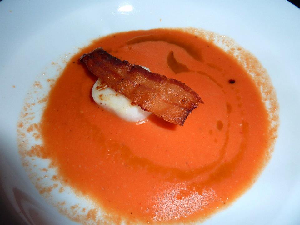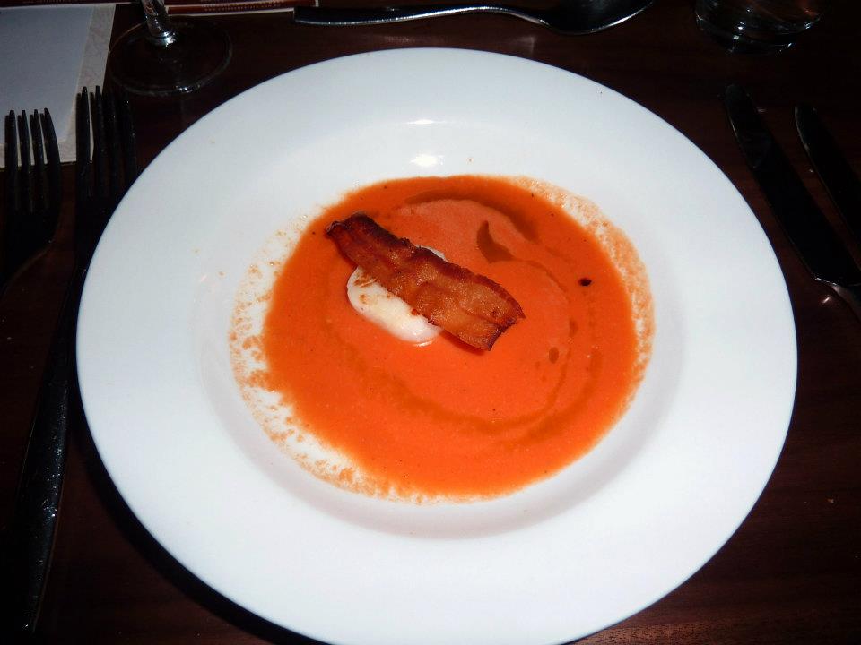 Moving along we were given some of the new vintage 2011 SSB – crispy and zesty. And perfect with the spice gaspaco that was our second course. Deliciously tasty, all the more special with its sweet scallop and crispy pancetta balanced on top. I had been worried about the prospect of cold soup, but I need not have been because done right, as this was, it was fabulous!