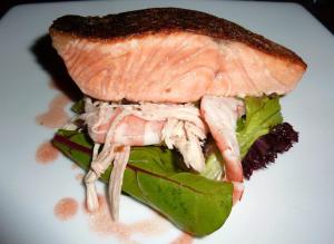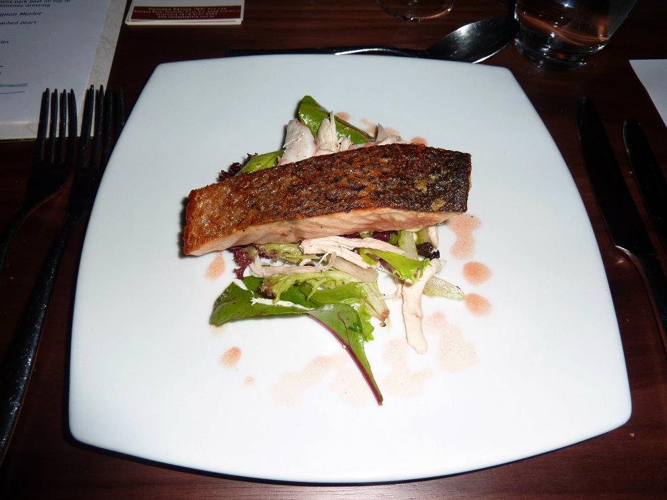 Next up was a seafood course. A very generous serve of crispy skinned salmon. Now as has been mentioned on previous musings I’m not a huge fish fan. I did try it though and couldn’t debate that it was well prepared, but I couldn’t get through it all. Needless to say though, with GG in tow it did not go to waste, and there were positives to the course, the best being the salad with its prawns and shredded chicken breast, which was a delight. All the more with its two vintages of chardonnay in tow. The buttery creamyness of the chardy served to enhanced the flavours of the salad. I enjoyed it all.