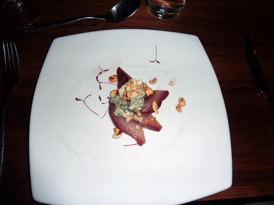 We began with some deliciously fresh bread and from there were presented with some elegant cornets filled with shredded beetroot and topped with goats cheese. The combination was entirely amazing, a little sweet and salty. Very nice starter. A Chenin came with this course and it was wonderfully light and fruity, a well matched accompaniment.