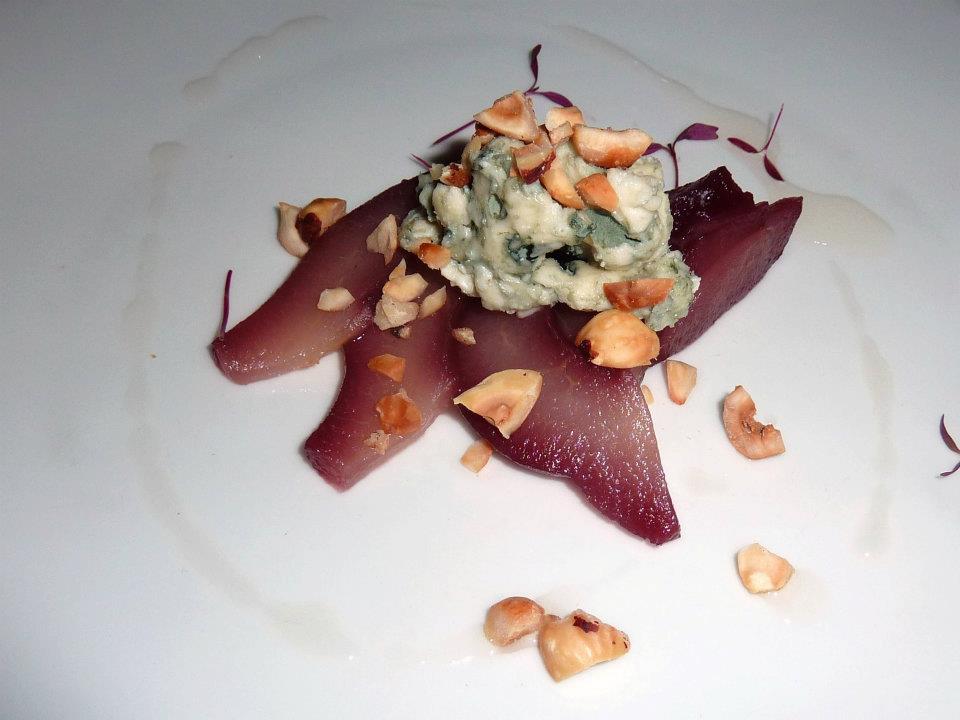 Then before dessert there was a cheese course. Always fabulous for me when a tribute to cheese is included. Especially when it is a tasty combination of red wine poached pears and roquefort blue cheese with a scattering of nuts. Happy sighs. I loved it. And I was super pleased when the lady to my right annnounced she wasn’t a blue cheese fan and presented her plate to me. Two serves of cheese, I am so incredibly lucky!