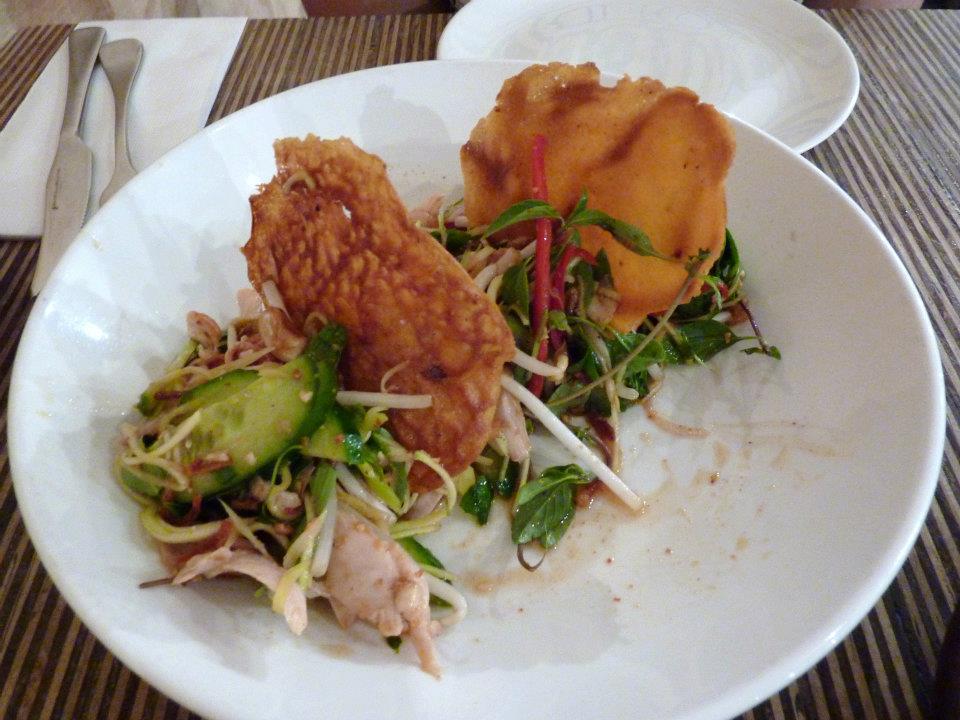 So what did we order? We decided we’d try the crisp vietnamese pancake, chicken, papaya & nahm jhim. It sounded like an interesting combination of flavours to me and also that it would suit the warmer weather. I sat my salad on top of one of the pancakes, which sort of tasted like a spring roll wrapper, pretty thin and very cripsy. The salad itself was that wonder blend of sweet and sour and salty. The chicken was nice and moist and in all it was pretty refreshing. I enjoyed the flavour, but towards the end of my serve it got fairly intense, a sentiment shared by GG, a lot of the same, but the good thing was we were sharing other dishes so it wasn’t as though you were sick to death of this one after splitting it. It was a good salad.