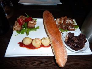 Then for our entrees we shared the “UPSCALE” tasting plate ($32). I”ll admit that when it was brought out I probably wasn’t overly impressed with the presentation. It all smelled very nice, but perhaps it was the big loaf of bread just plonked in the centre probably didn’t do it for me. But more important than looks, how did it all taste….