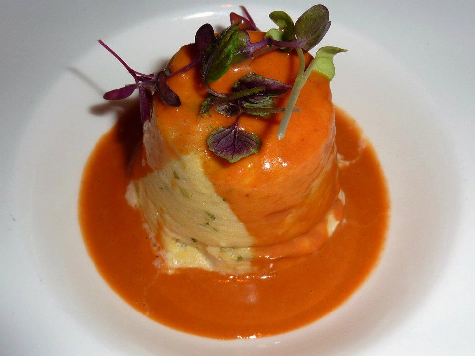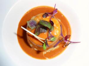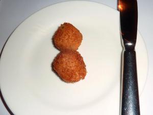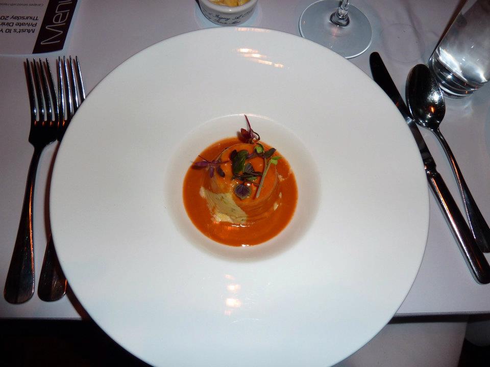 So we were given a glass of Henroit “Souverain” Brut NV Reims Champagne as we entered and knew that the first offering was to be canapes. The looked fairly familiar to the ones we had the previous visit….a croquette of sort. Very tasty, but the dilemma was that the timing was a little out so our glass of champagne was long gone by the time the deep fried goodies arrived. It sort of created a bit of a lag with the other courses and their matched wines.