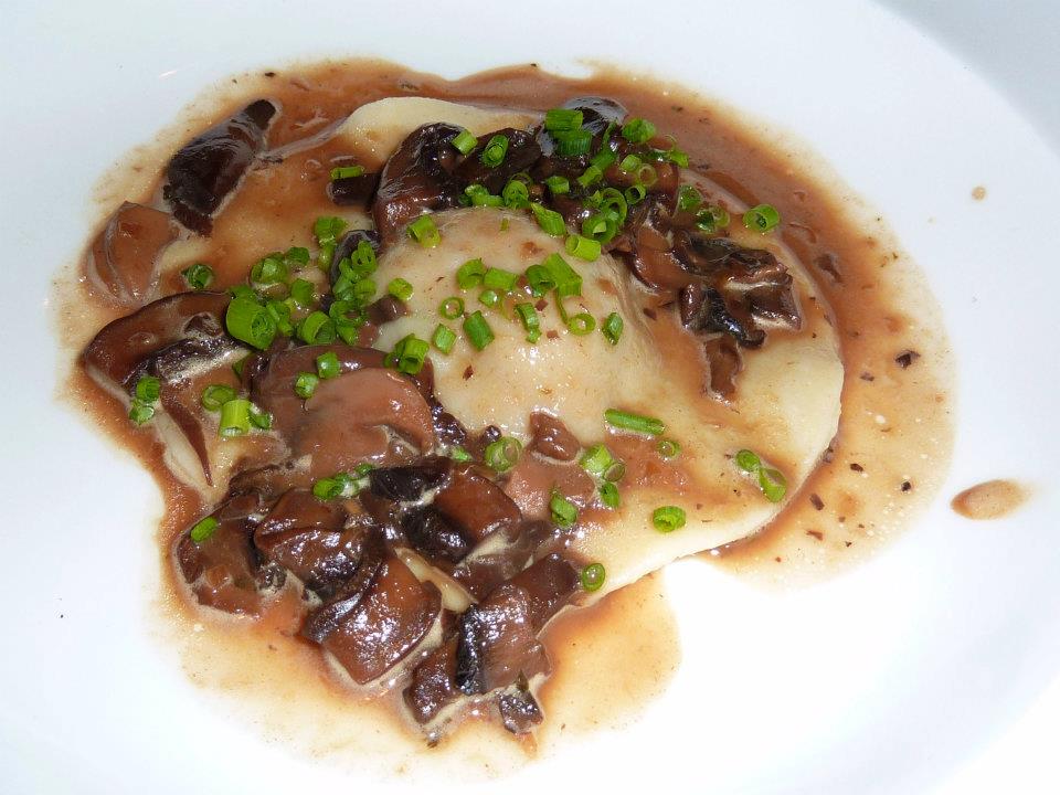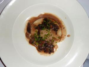 I was surprised that a pasta course was scheduled for so late in the evening and I was feeling a little on the fuller side by this stage so was a little daunted. But an elegant single ravioli was presented – White Rocks Veal Shin Ravioli, Wild Mushroom Creme and Truffle Oil with a Seppelt’s St Peters Shiraz 2007 from Grampians in Victoria. There was a strong mushroomy flavour to this dish (unsurprising given the menu description I suppose 🙂 ). The meat in the ravioli was delicious, but I found the pasta a little on the chewy side which was slightly disappointing. I thought they were right on size wise with this course though.