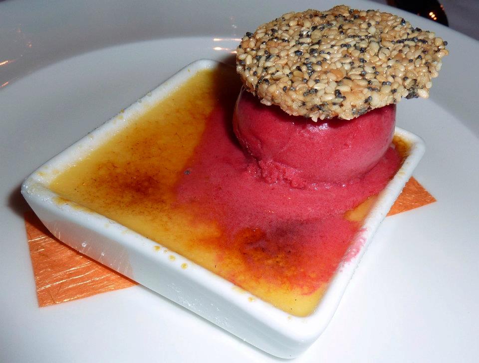And finally with just a little room to spare dessert arrived – Orange and Vanilla Creme Brulee with Raspberry Sorbet Sesame Snap with two desserts wines, a Domaine Disnoko Aszu 5 Puttonuos 1993 from Tokaji in Hungary and also a Oremus Aszu 5 Puttonyos 2002 from Tokaji in Hungary. This dish was very similar to the one I’d had for the work christmas do that I’d been to at Must. They do a very good brulee and I quite liked the raspberry sorbet to cut through some of its sweetness.