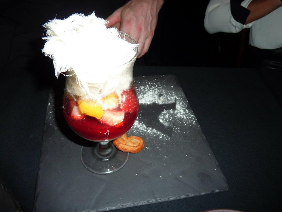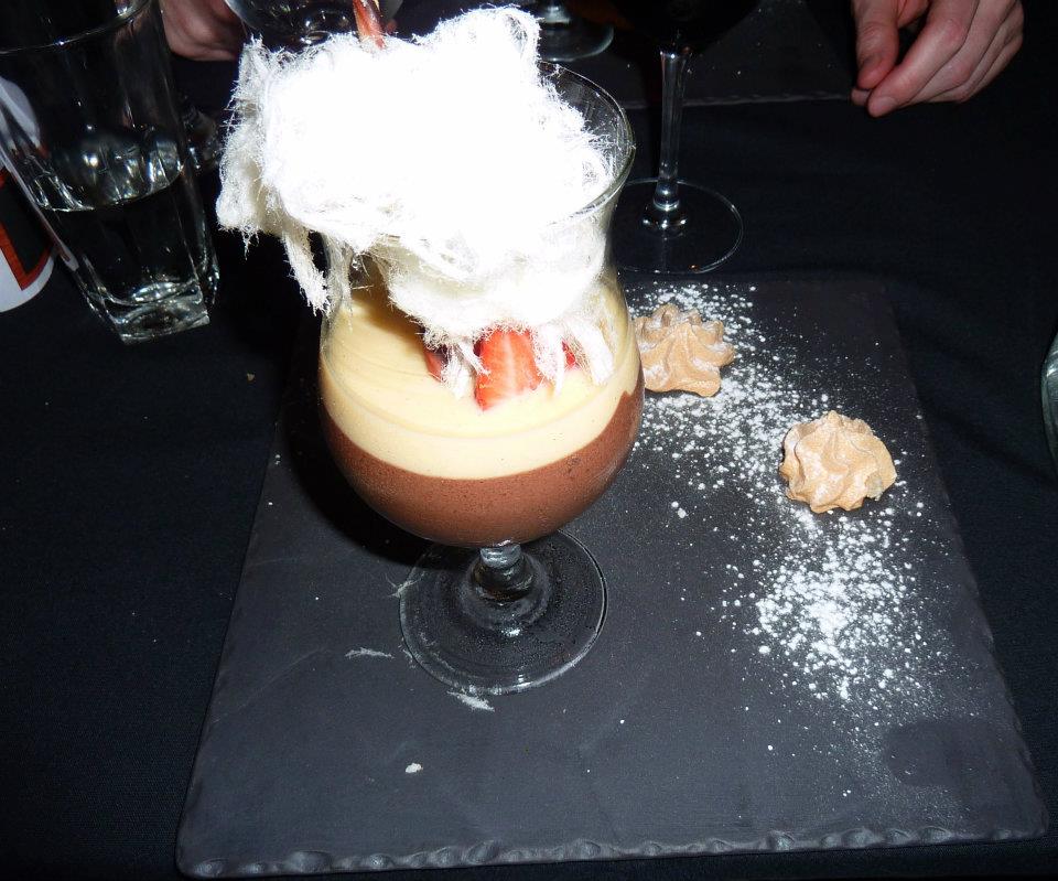Chocolate mousse – rich at the best of times and quite a vision in presentation at this establishment. A top some slate sat a large wine glass full of mousse and what tasted like a little crème anglais and this above that spun sugar. The slate then had a few meringue stars nearby and a light dusting of icing sugar. Looked all a bit special. And the taste was equally as pleasing. While Mrs M had to tap on hers, I managed to just make it through. The boys also made it to the end of those, agreeing, as with other courses that they were very delicious.
