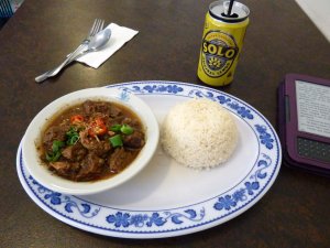 The temperature inside was pleasant and I found myself an empty table and waited to be served. I was quickly bought a menu and on having a quick look through, I’d initially thought of going with the chicken curry – sounded very tasty, but in the end I thought I’d give the Beef Rendang ($10) a go. Not sure why such a spicy dish appealed on such a warm day, but I also ordered a Solo to counter any heat.