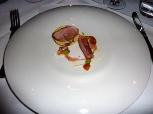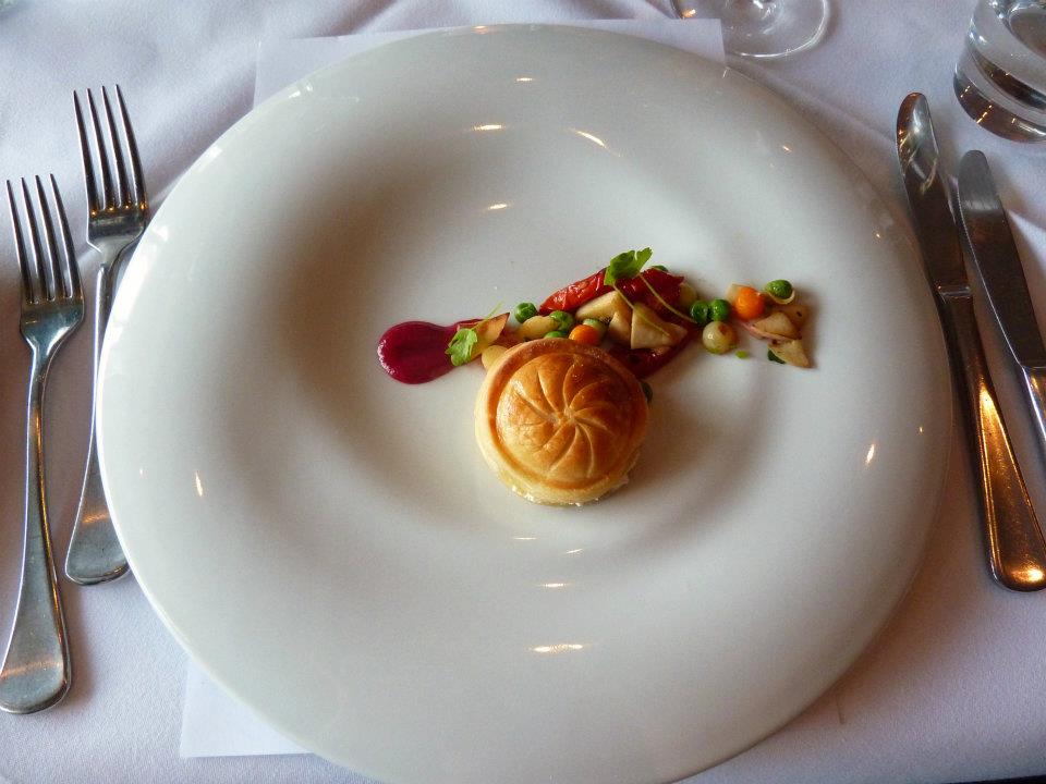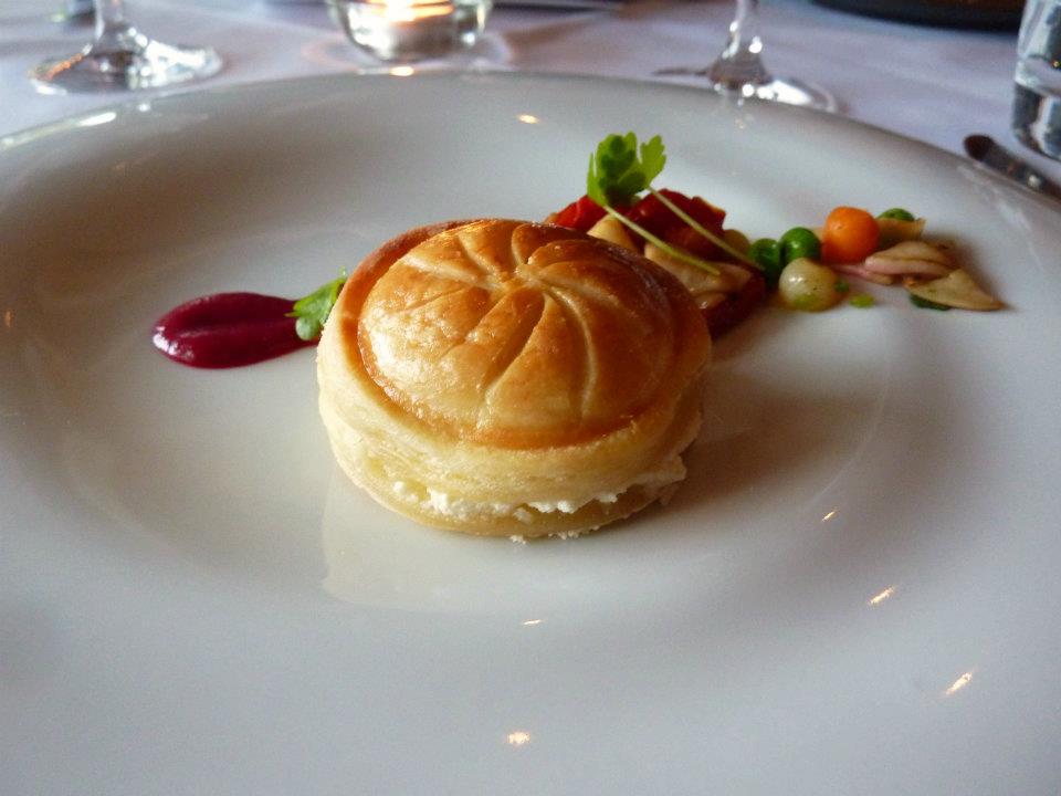 Following on was a course with more cheese – Goats cheese pithivier, mushroom and asparagus ragoult. I was loving how much cheese there was in this set menu. I had googled before arriving what a pithivier was. Basically like a pastry biscuit with something inside. Another tasty and beautifully presented course. The bright crunchy vegetables, contrasting nicely with the melt in your mouth pastry and the decadently creamy goats cheese. Delightful!