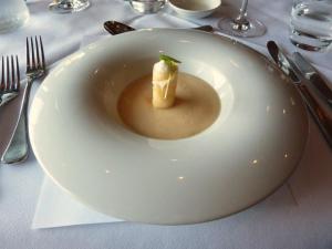 Not too long after the first official course arrived – Cauliflower soup, blue cheese cannelloni. . A white soup bowl with a cigar of pastry stood in the centre, filled with a blue cheese foam, and topped with a microherb for colour. Once on the table our friendly waitress poured the cauliflower soup from a little jug. I thought this was a nice touch – quite the dramatic flourish. I quite like cauliflower soup, it has a wonderful creaminess to it. This soup was probably just a touch too salty. When mixed with some of the blue cheese it seemed to balance it out slightly and by the end of the dish I didn’t really notice, but just initial impressions was that there was a smidge too much of the salty stuff.