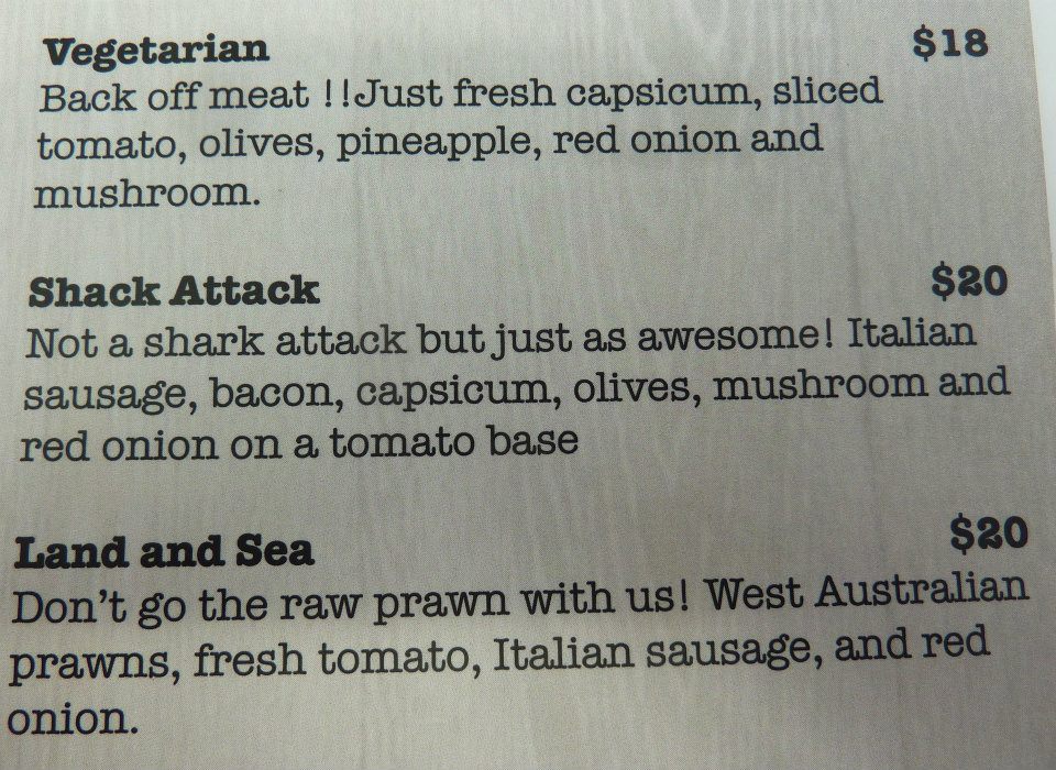 A slight aside…… they advertised a pizza on their menu called the Shack Attack……. I found myself bemused at its description. Sparked an interesting response when I posted it on my facebook wall…. Most people thought it didn’t really fit, while others argued that the meaning of “awesome” was being misinterpreted. Hey each to their own I suppose.