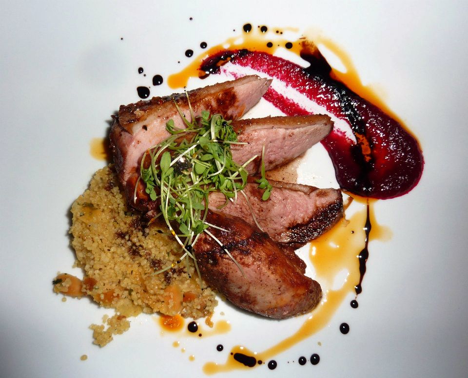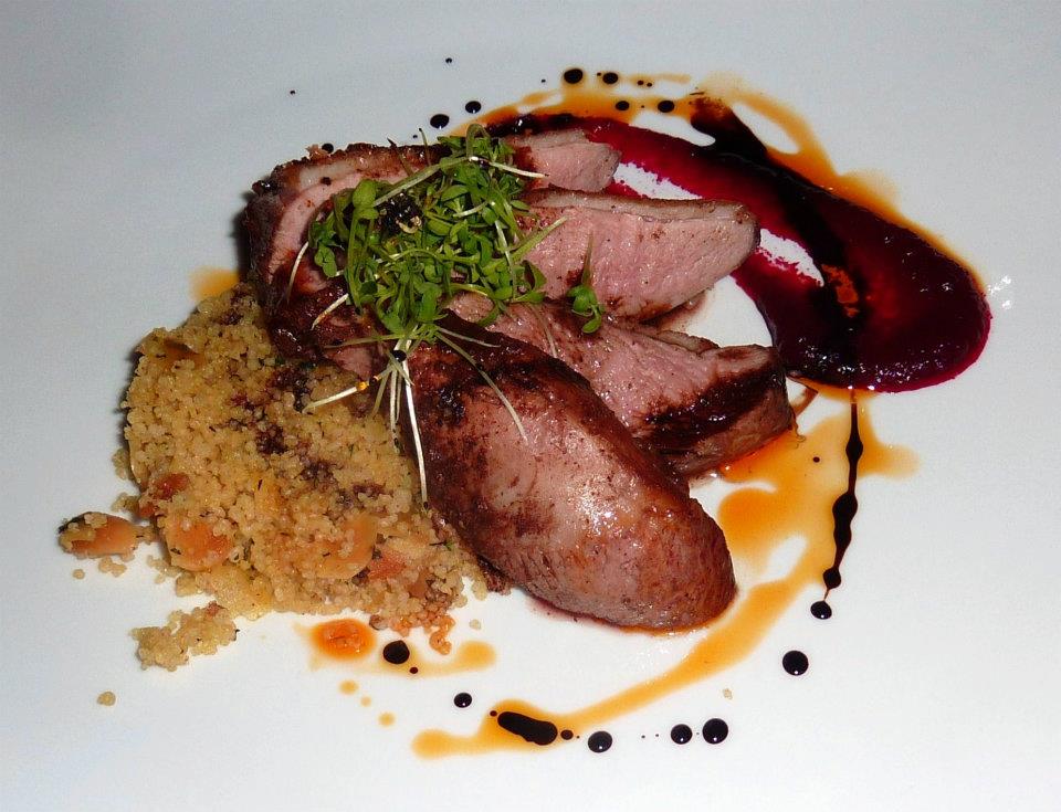 As some of you may know 2011 was the year of the duck. I ate a lot of it and for the most part really enjoyed it! So I was in no way disappointed to see that a duck course had quacked its way into 2012. Woohoo! Let the good times roll! Mains was a Five spiced duck breast, Mediterranean cous-cous, beetroot puree, muscatel and shiraz jus. And there was a generous amount of duck on the plate that was all the more pleasing! Pink and perfectly delicious, it went well with the spicy cous cous and a little of the beetroot puree. I have a lot of time for beetroot. It’s a great addition both flavour wise and visually it adds such a nice splash of colour to any plate.