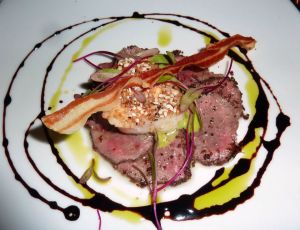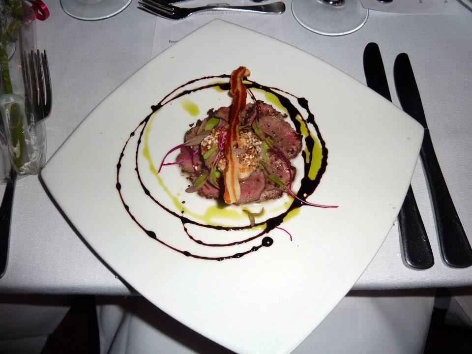 The entrée was up next – Sumac crusted kangaroo Carpaccio, dukkah crusted seared scallop, pea puree, crisp pancetta. The Carpaccio was slightly thicker than I had had previously but the flavour was amazing! And scallops with Dukkah – what a revelation! Another winning combination where our only wish was that there was more of it! But we knew there were more dishes on the way and we definitely wanted to save room for them!