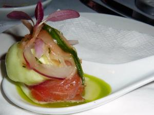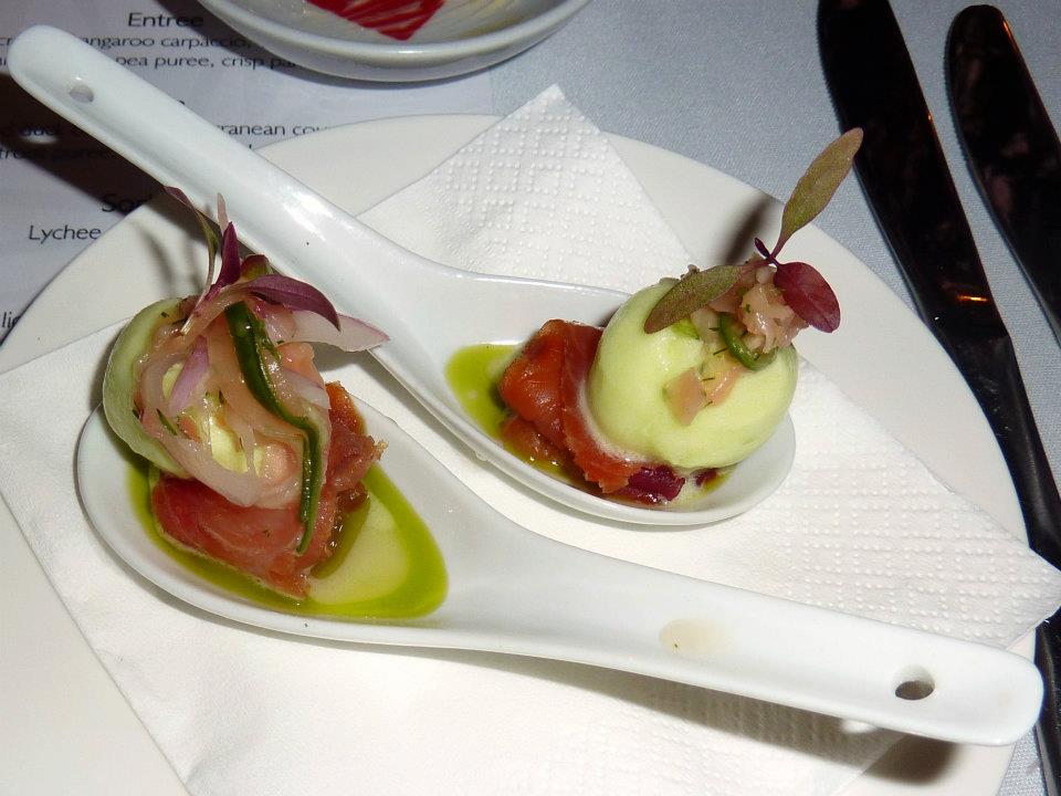 Up first was an Amuse Bouche of Beetroot and vodka cured salmon, lemon sorbet, pickled ginger. Artistically balanced on a large ceramic soup spoon it did looked very pretty. And then we ate it. Wowsers, if we had been impressed with its appearance the flavour was all the more amazing. The salmon melted in your mouth, not a trace of fishy flavour (yay!) and the combination of the sweet beetroot, the refreshing chill of the lemon sorbet and the pickled ginger was just divine. How good is ginger!! One mouthful in and we were sold! Very nice food! Couldn’t wait for the next course to arrive.